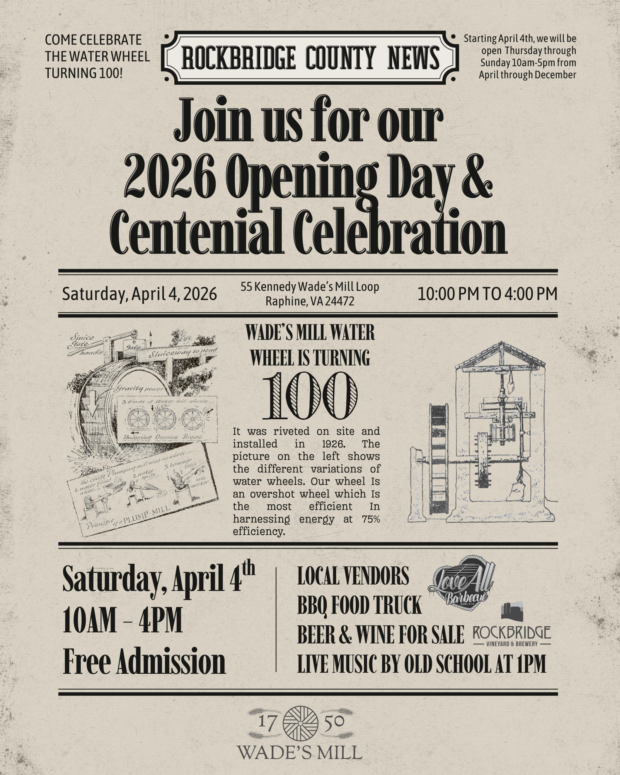 Come celebrate Opening Day at Wade’s Mill!